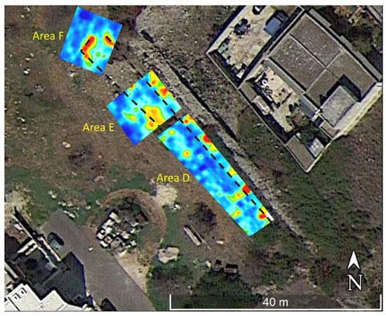 Georeferenced time slices of the GPR survey at depth z = 0.6–0.7 m. Orange to red high-amplitude anomalies are related to buried structures. The black dashed line highlights the alignment of the anomalies found in Area D, Area E, and Area F.