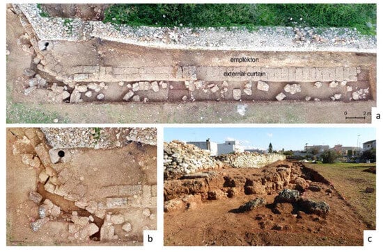 The archaeological excavations began in January 2024 and confirmed the geophysical results acquired the previous year, documenting a long stretch of the city wall that is preserved for a maximum length of 32 m and a maximum height of 1.60 m (Figure 9a). In this sector, the fortifications are characterized by two curtains with large blocks of calcarenite arranged alternately, head and cutting, with an internal emplèkton made up of earth and calcareous stone.