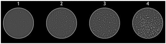This work focused on four (4) categories of flaw indications in digital X-ray radiography images of aluminum and magnesium die casting, as contained in ASTM E2973-15 Standard Digital Reference Images for Inspection of Aluminum and Magnesium Die Casting, which provides a guide to enable recognition of specific casting discontinuity types and their corresponding severity levels. Figure 2 shows reference sample images from ASTM2973-15, showing Porosity in aluminum die casting at distinct levels of severity, ranging from the least (1) to the highest (4).