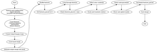 The flaws were extracted from multiple images to form a repository of flaws of varied sizes and morphologies. The extracted flaws were used to populate our input images, randomly assigning 4 distinct color codes to differentiate the 4 different flaw classes considered in the ASTM E2973-15 Standard. The distinctiveness of the colors used offers the proposed grading algorithm the ability to adequately detect each flaw and ensure their subsequent separation of the entire flaws into respective classes. Details of the color codes that were utilized are provided in Table 1. With this approach of synthetically generating the test cases, a large variety of flaw distributions were realized and used to effectively test and validate our flaw grading pipeline. A schematic description of the methodical approach used to generate the input images is described in Figure 3.