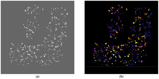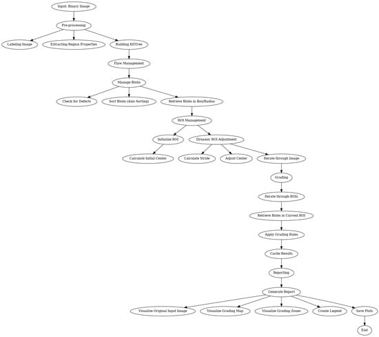 To have a test dataset that will be sufficiently representative of real-world scenarios, test images were generated with random placement of the 4 flaw classes (Porosity, Shrinkage, Cold Fill, and Foreign Body) that significantly vary in morphology and size within a predefined region of the image. To execute the grading of flaws in the input images, several key steps are particularly important, including the algorithm’s identification of flaws according to different classes (Porosity, Shrinkage, Cold Fill, and Foreign Body), followed by the creation of a class-based binary mask retaining the exact spatial positions of the detected flaws. Therefore, for each given input image, binary images were generated, with each one containing only a specific class of defect that was separated by the color coding in the input image. Furthermore, these binary images were individually processed as input for a class-based assessment of the properties of flaws belonging to that specific flaw class, followed by the subsequent grading steps. Hence, in the case described in this work where four flaw classes were considered, the grading process is applied for a maximum of four times if all flaws are detected in the input images. It is important to mention that when applied to already existing flaw detection and characterization algorithms, a synchronization must be realized between the output representation of such algorithms and the input search of our proposed algorithm. In Figure 5, a schematic representation of the methodology utilized in this work is presented.