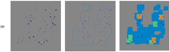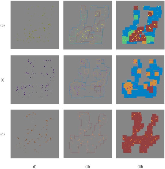 The output of this grading pipeline is presented as an overlay of activated regions of interest within the processed input image that has a flaw distribution that meets the reference terms utilized in this study. The results are presented according to flaw classes to ensure better visualization and easier human validation. Four severity levels are considered, each assigned a region-of-interest (ROI) color for identification. The color codes for grade 1 through grade 4 are blue, green, orange, and brown. Each flaw class is treated separately, and the grading terms used are as described in Table 2. Grading is achieved per unit area of 700 mm2 on the input image as documented in the reference document. When multiple activated ROIs overlap, the combined areas of the ROIs are seen in the results as presented in Figure 6. When activated regions of interest (ROIs) corresponding to different grading terms overlap, the ROI associated with the higher severity level is assigned visualization precedence. The Foreign Body class, if detected, returns as grade 4 (brown ROI) in accordance with the reference terms in Table 2.