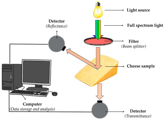 NIR spectroscopy stands out for its rapid, nondestructive analysis, allowing for real-time monitoring of cheese maturation and quality. This technique is particularly advantageous because of its minimal sample preparation requirements and the ability to provide immediate results, making it suitable for on-site analysis in cheese production [27]. NIR spectrometers typically comprise a light source, beam splitter, sample detector, optical detector, and data processing unit, as schematically illustrated in Figure 2. It utilises various wavelength selection technologies to cater to different analytical needs [28].