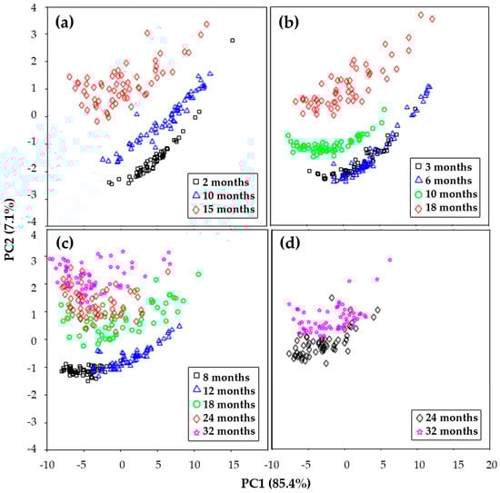 Figure 3. Principal component analysis score plots using FT-IR spectra for Cheddar cheese from various brands: (a) Bega, (b) Great Ocean Road, (c) Mainland, and (d) Cracker Barrel [29].
