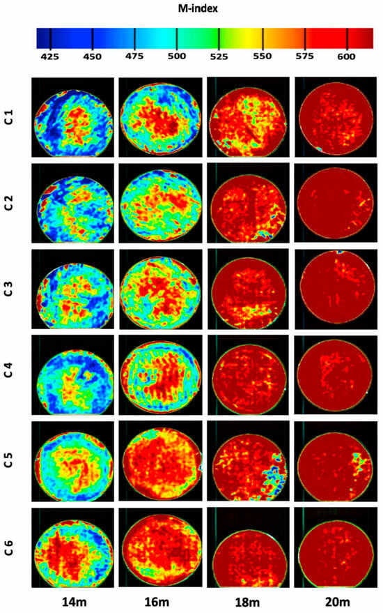 Bittante et al. [6] demonstrated the efficacy of different spectrometers in capturing the absorbance spectra of diverse cheese samples, revealing the distinctions between transmittance and reflectance spectra. Similarly, Priyashantha et al.’s studies [37,45] showcased NIR-HS imaging’s potential to visualise and model cheese maturation, utilising PLS regression to correlate spectral data with maturity levels, as depicted in Figure 4 and Figure 5. NIR-HS imaging technique’s ability to provide a comprehensive visualisation and modelling of cheese maturation stages signifies a leap forward in understanding the structural and chronological dynamics of cheese ripening.