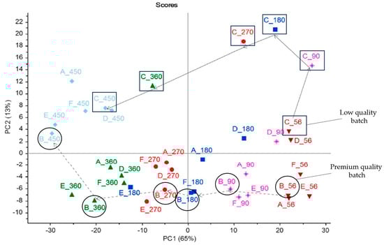 The study by Chen et al. [33] offers significant insights into the maturation process of Cheddar cheese using NMR spectroscopy, highlighting the potential of metabolomics in predicting cheese quality. The PCA plot presented in Figure 9 describes the maturation paths of different cheese batches, with premium Batch B and lower-quality Batch C showcasing divergent trajectories. This variance underscores the detailed relationship between the metabolomic profile and the sensory attributes of cheese as it matures. Moreover, the study underscores the importance of specific metabolites in defining the sensory attributes of mature Cheddar cheese. For instance, it highlights the association of tyrosine, tyramine, and lysine with these attributes, as well as the correlation of β-galactose and glycerol with the attributes of younger cheese. These findings underscore the interpretive value of the PCA plot in Figure 9, providing a visual and analytical representation of how cheese evolves over time, a key insight from the study. Moreover, Chen et al.’s study [33] emphasises the role of metabolites in the maturation process, and showcases how NMR spectroscopy, coupled with PCA, can offer profound insights into the ripening process, aiding in the development of predictive models for cheese quality. This could significantly benefit cheese producers by allowing more informed decisions regarding the ageing process, potentially leading to more consistent and optimised production outcomes.