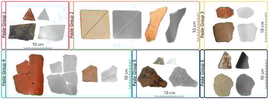 Paste 2, Paste 3 and Paste 6 do not present the second type of tempering materials that agree with our previous description of this pottery. These Paste groups have symmetrical distributions and high material homogeneity. In the case of Paste 1 and Paste 4, the second type of tempering materials could explain the appearance of the shoulder on the right. In these groups, only a small percentage contains the second type of tempering materials. In the case of Paste 5, the presence of a second type of tempering material contributed to the low homogeneity. It is worth mentioning that all objects in the group contained the same kind of tempering material.