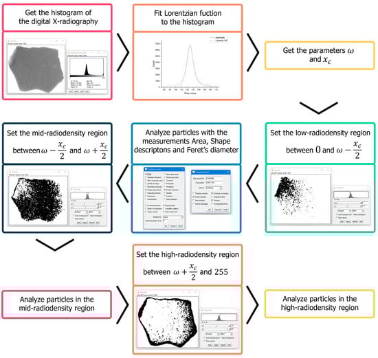 ImageJ 1.54d was used. Figure 2 presents the flowchart describing the methodology for analyzing tempering materials. The first step is obtaining the histogram and describing its behavior. The material behavior is described with the different distributions of the histogram; each maximum in the histogram distribution is related to a ceramic paste [].