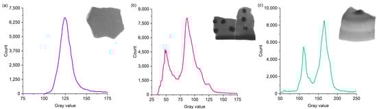 The three parameters used to describe the tempering materials are area, to determine the proportion of tempering materials in the pottery; Feret’s diameter, to describe the grain size [] (the tempering material’s grain size is less than [,]; due to the flat panel resolution, this distance is ()); and circularity, aspect ratio, and roundness, to describe the shape of the tempering material.