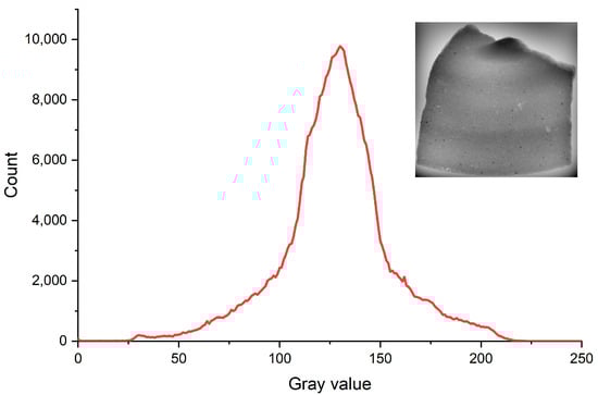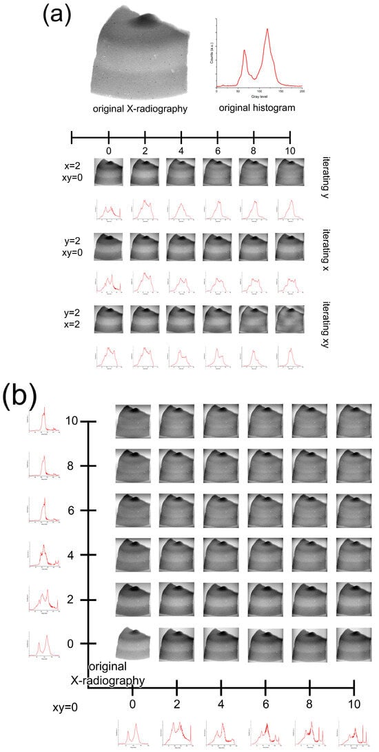 The fit polynomial plug-in was originally developed to correct the illumination of microscopy images []. We can apply the plug-in because, in understanding X-radiography, for the positive, the thickening is presented by the decrease of gray values, and the thinning is presented by the growth of gray values; in other words, the thickening in a digital image can be understood as shadows and thinning can be understood as lights. The plug-in has three conditions, x, y, and xy; the conditions must be iterated to choose the fit polynomial that only presents one maximum in the histogram distribution and that maximizes the parameter in the Lorentzian adjust (Figure 4). With this enhancement, the histogram distribution is homogenized, allowing us to highlight the tempering materials hidden in the sherd geometry (Figure 5).