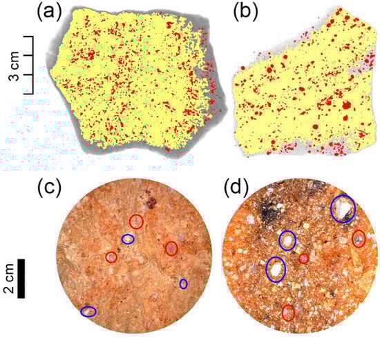 (Top) Highlight of clay matrix (yellow) and tempering materials (red). (a) This object has 6.42% of tempering materials with respect to the total pottery, and they are not well-formed. (b) This object has 5.5% tempering materials with respect to the total pottery and predominantly has well-formed inclusions. (Bottom) Microscopy side view of the pottery, with red circles marking the calcite and blue circles indicating the possibly silicate particles. (c) No well-formed tempering materials object. (d) Well-formed tempering materials object. See Appendix B for complementary information.