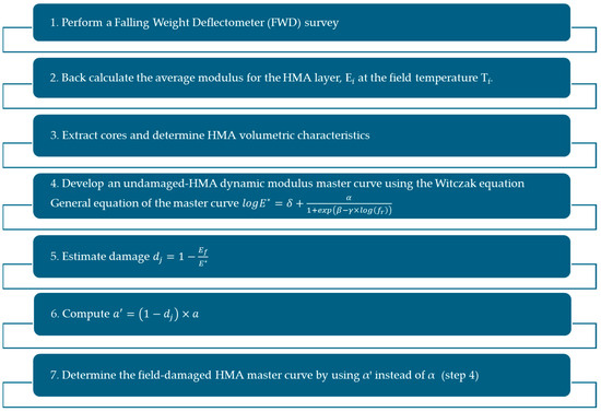 The above methods are promising but time-consuming. Therefore, their applicability is not practical. The MEPDG (Mechanistic-Empirical Pavement Design Guide) represents a significant milestone in the field of pavement engineering [16]. It is a rigorous, multiparametric method and presents various aspects such as material characterisation, new pavement design, rehabilitation design, and characterisation of existing pavement layers characteristics. For the latter, the MEPDG introduces a method that involves creating a damaged E* master curve tailored to field conditions, utilising in situ NDT data from the FWD, along with an algorithm to estimate E* (Figure 1). Unlike the traditional modulus master curve, which assumes a pristine, undamaged state, the damaged modulus curve accounts for the degradation of the material over time due to repeated traffic loads and environmental stresses. Step 3 can be realised either through extensive laboratory testing on field cores (Level 1) or through limited laboratory testing and/or historical data (Levels 2 and 3). However, research on the applicability and accuracy of the proposed damaged E* master curve method is limited. Loulizi et al. [17] concluded that the proposed methodology can provide accurate results, but also pointed out some drawbacks. Solatifar et al. [18] made some adjustments to the method to accurately estimate the E* master curve.