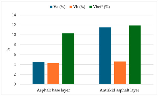 Figure 5 presents the aggregate gradation of the asphalt layers. Figure 6 shows the volumetric composition of mixes, namely air voids content (Va), asphalt content (Vb), and effective asphalt content (Vbeff).