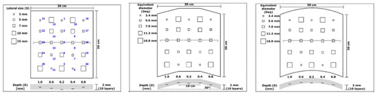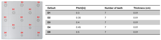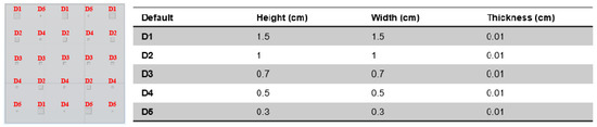 A composite sample with dimensions of 30 cm × 30 cm and a thickness of 2 mm serves as the planar model utilised in the simulation. This model has 15 square-shaped defects, all with different sizes and depths, and is made to look exactly like the original sample. A comprehensive dataset for identifying and evaluating thermal anomalies in a flat composite structure is provided by the defects dispersed throughout the surface and varying in size. There are five distinct dimensions and depths to the faults, as given in Figure 4.