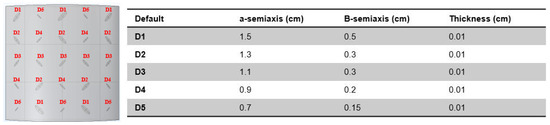 After simulating the three models we had in our lab and confirming that the data from the simulation and the real world were similar, we created other models, primarily curved ones, to increase the size of our dataset. We decided not to use square defects in this step to keep our model from overfitting to square patterns. Instead, we developed two curved models with defects that are ellipsoidal, as shown in Figure 6. Every model has 15 defects of five different sizes and five different depths, 30 cm by 30 cm in length. The distinction between the two models lies in the orientation of the defects: the first model has defects aligned horizontally and vertically. In contrast, the second model has defects directed at a 45-degree angle.