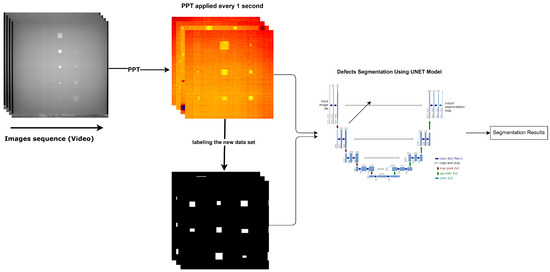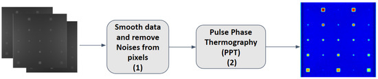 Next, pulse phase thermography (PPT) is applied to analyse the thermal signals more effectively [16]. This step introduces a thermal pulse to the surface, and the subsequent cooling process is recorded. The thermal response is transformed into the frequency domain through fast Fourier transform (FFT) techniques. PPT helps to visualise the defects more clearly by highlighting variations in thermal conductivity and heat retention across the surface, making it easier to detect defects in the data.