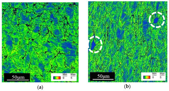 Moreover, the stored energy distribution in annealed samples is explained through kernel average misorientation (KAM) maps (Figure 6), to explain the local misorientation of microstructural grains and lattice distortion at each point inside a grain. In KAM maps, a green color is assigned to higher KAM values for more lattice defects, whereas blue-colored grains represent strain-free regions with low KAM values [30]. The stored energy released at a low temperatures (450 °C) suggests the occurrence of recovery by substructure evolution (Figure 6a). Figure 6b shows the low-strained regions grains in blue in 580 °C annealed samples, with an average KAM value of 0.62°. Further annealing at higher temperature increases strain-free grains with the progress of recrystallization, which is attributed to the decrease in the KAM value (Table 1). The equiaxed structure of the fully recrystallized (annealed at 660 °C/900 s) sample explains the mostly blue-colored grains with further decrease in the KAM value (0.58°) and a lesser orientation deviation inside the grains (Figure 6c). Annealing at 690 °C causes grain growth with dominant high-angle boundary and lesser KAM value (Figure 6d). Therefore, the KAM value fraction increases at lower ranges with increasing annealing temperature (Figure 6e). This observation is in good agreement with the investigation described by Fang et al. for Ti-bearing and Nb-bearing high-strength low-alloy steels [44]. They explained that the initial recovery and subsequent coarsening during annealing induces softening with the reduction of stored energy. Additionally, the recrystallization kinetics are reported for the surface and center layers of deformed steels using KAM maps. The kinetics at the surface are faster than in the center region. This is due to the variation in stored energy in hot bands as well as work hardening during cold rolling.