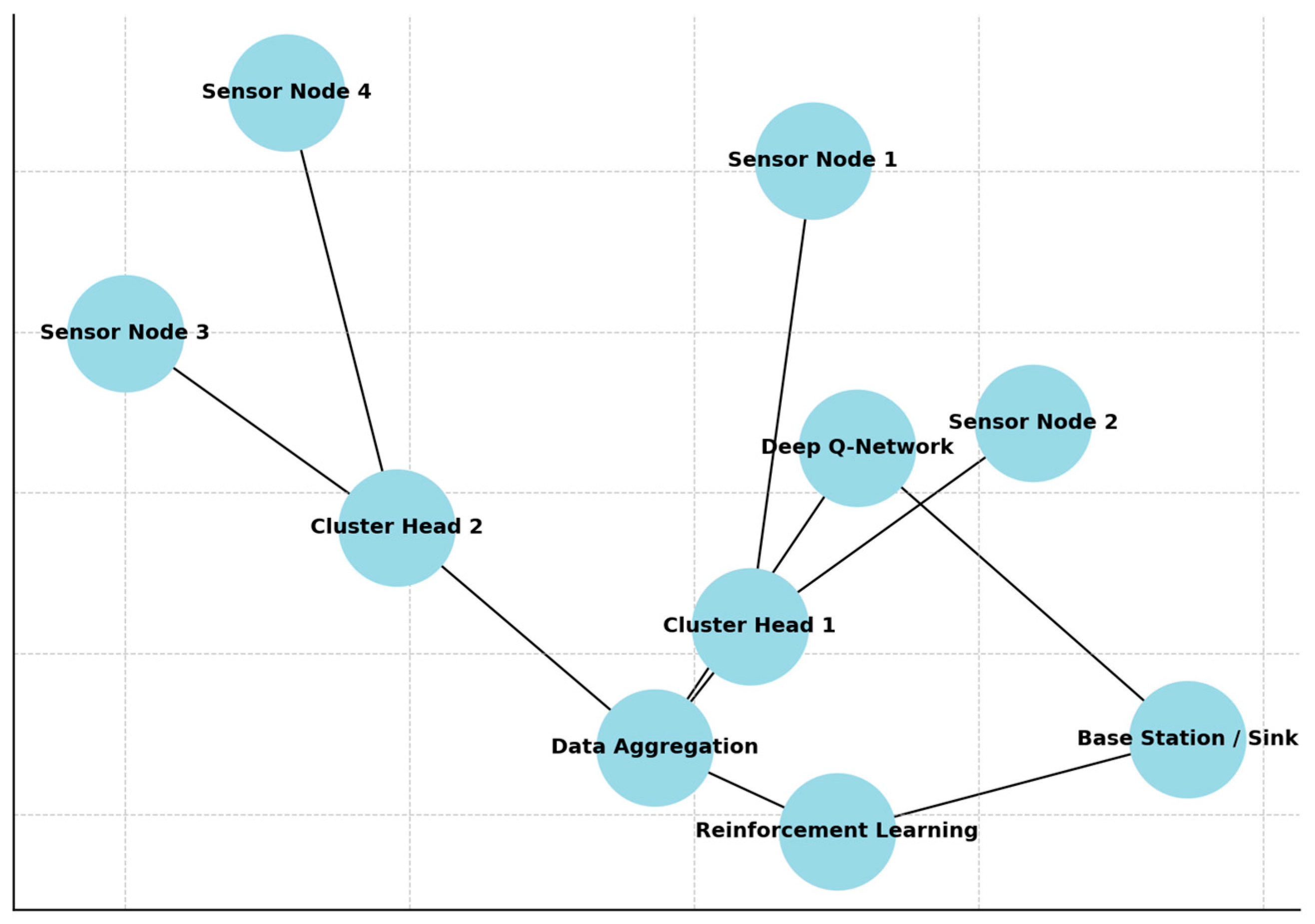 11]. RL enables distributed decision-making by allowing nodes to learn from their interactions with the network environment and adapt strategies that optimize long-term energy efficiency and reliability. Deep Reinforcement Learning (DRL), and specifically Deep Q-Networks (DQNs), further enhance this capability by approximating Q-values through deep neural networks, thereby enabling efficient learning in large-scale state-action spaces inherent to WSNs [