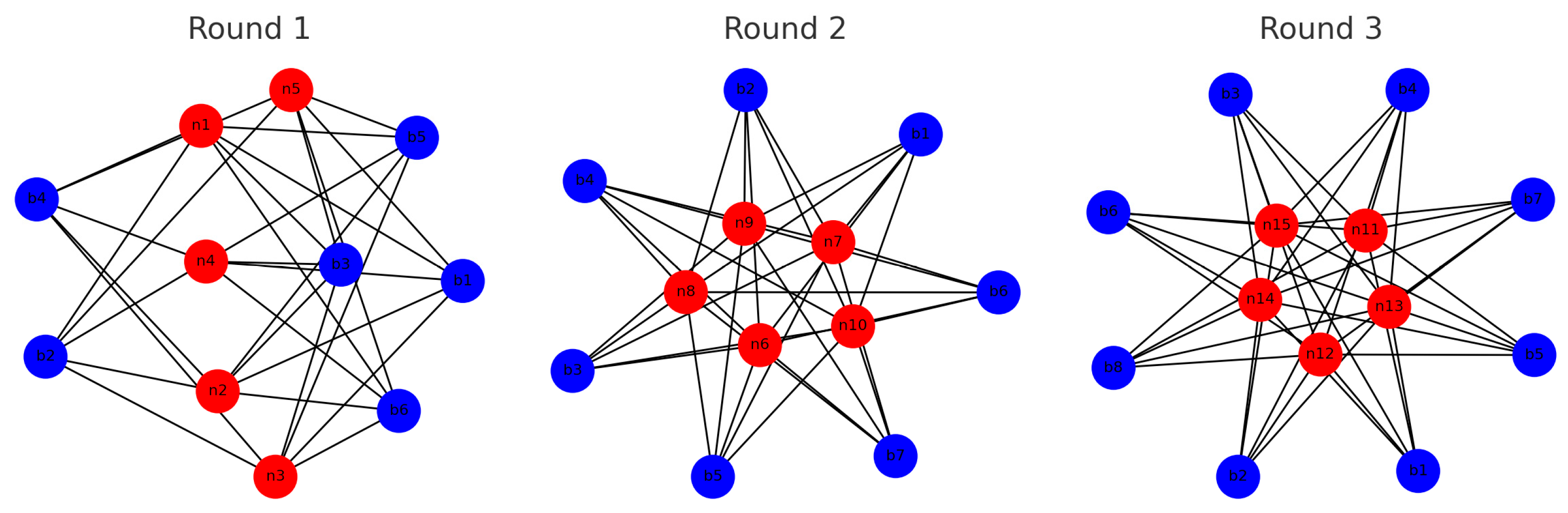 In Round 2, the selection of CHs is influenced by both the residual energy of nodes and their relative proximity. The newly elected CHs, again marked with red crosses, differ from those in the previous round, while the blue crosses continue to represent ordinary nodes. The changes in node–CH connections reflect a dynamic restructuring of clusters, which balances energy dissipation and prolongs the operational lifetime of the WSN. Such reorganization prevents excessive energy burden on specific nodes, thus mitigating uneven energy distribution and avoiding premature node failures.
