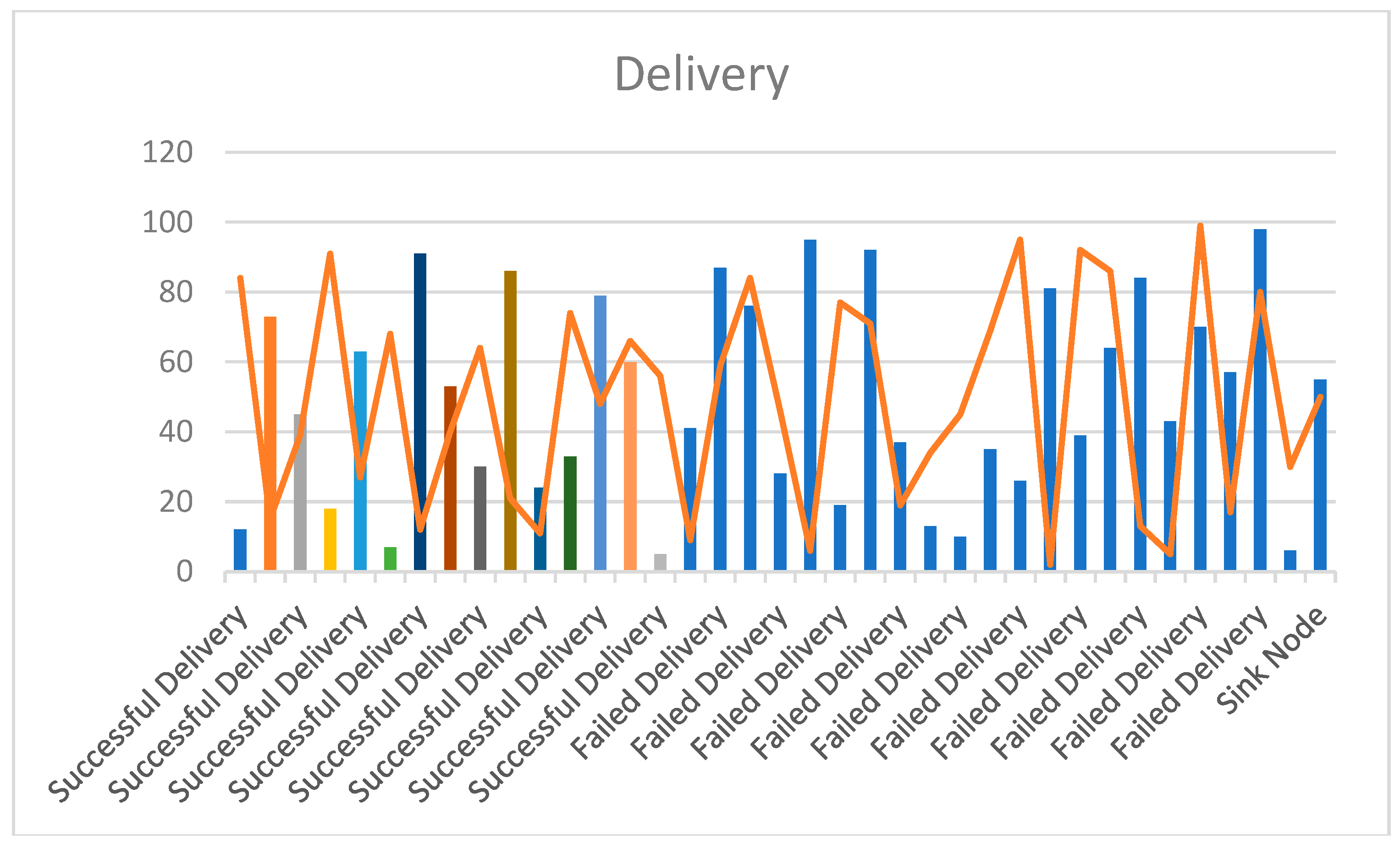 Figure 7. The delivery outcomes were randomly assigned to reflect variable communication conditions such as signal attenuation, interference, or node energy levels. Analysis of the spatial distribution revealed that nodes located closer to the sink generally experienced higher success rates, whereas those positioned near the boundaries of the simulation field were more prone to delivery failures. This observation aligns with known limitations in WSNs, where greater transmission distances and limited relay options can adversely affect network reliability. The study underscores the importance of considering spatial placement and routing strategies in WSN design to enhance data delivery efficiency and reduce transmission loss. These findings provide a foundational understanding for future work involving dynamic routing protocols and energy-aware communication models in sensor networks.