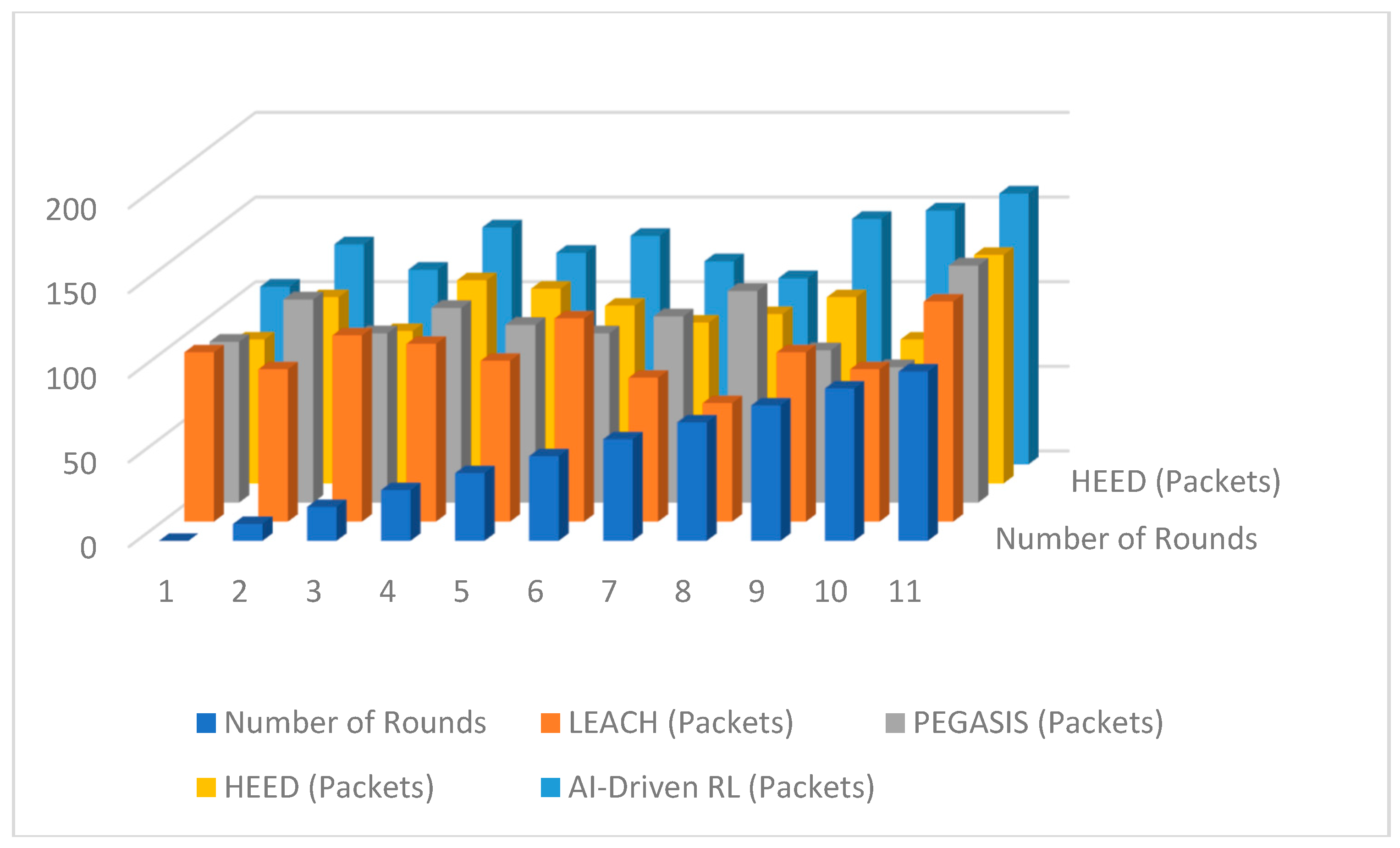 Figure 8, contains four routing protocols—LEACH, PEGASIS, HEED, and the AI-driven reinforcement learning approach—was evaluated over multiple simulation rounds. The horizontal bar chart indicates the number of packets handled by each protocol at different intervals.