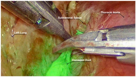 A total of 3 mg of ICG diluted in 5 mL of saline solution was injected bilaterally into the inguinal lymph nodes by our interventional radiologist while the patient was supine and intubated. Approximately 15 min elapsed from the ICG injection to the reopening of the previous surgical incisions. At the exploration in the pleural cavity, we individuated two blood clots adherent to the parenchymal suture, but no active bleeding sources. Eventually, with the dedicated ICG filter in the thoracoscopic optics camera, lymphatic vessels on the left side were clearly visualized, and the leakage point was precisely identified at the level of the previous carinal lymphadenectomy. The leak was successfully ligated with metal clips (Figure 1) and with application of nebulized cyanoacrylate for further tissue sealing. Supplementary Material: The video of the procedure can be found at https://zenodo.org/records/13786288 (accessed on 28 October 2024).