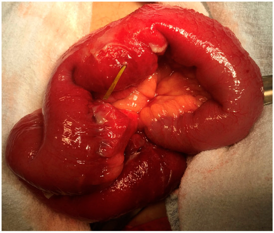 - Hines, J.; Rosenblat, J.; Duncan, D.R.; Friedman, B.; Katz, D.S. Perforation of the mesenteric small bowel: Etiologies and CT findings. Emerg. Radiol. 2013, 20, 155–161. [Google Scholar] [CrossRef] [PubMed]