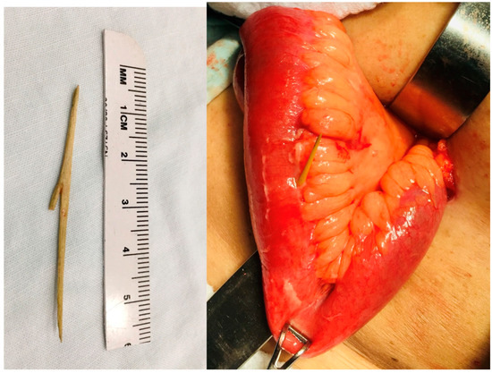 - Nicolodi, G.C.; Trippia, C.R.; Caboclo, M.F.; de Castro, F.G.; Miller, W.P.; de Lima, R.R.; Tazima, L.; Geraldo, J. Intestinal perforation by an ingested foreign body. Radiol. Bras. 2016, 49, 295–299. [Google Scholar] [CrossRef] [PubMed]
