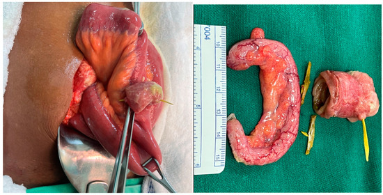 In Case 5, a perforated transfixing Meckel’s diverticulum was observed, accompanied by edematous, distended loops and peritonitis. The diverticulum contained small bone fragments, along with a congested cecal appendix (Figure 5).