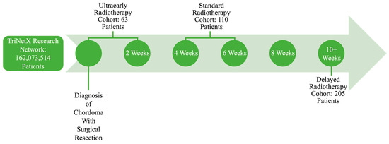 Introduction: Chordomas are rare, locally aggressive tumors of the spine and skull base typically managed with maximal surgical resection followed by adjuvant radiotherapy. Although postoperative radiotherapy improves local control, the optimal interval for initiation remains uncertain, as early delivery may exacerbate wound-related complications while delayed initiation may allow tumor progression. Methods: We performed a retrospective cohort analysis using the multi-center, national TriNetX Research Network. Adults with histologically confirmed skull base and/or spinal chordoma who underwent surgical resection followed by radiotherapy were stratified into ultraearly (≤2 weeks), standard (4–6 weeks), or delayed (≥10 weeks) radiotherapy initiation groups. Propensity score matching was used to adjust for demographic and clinical covariates. The primary outcome was all-cause mortality at 1, 3, and 5-years. Secondary outcomes included wound dehiscence, surgical site infection, and neurologic complications. Results: A total of 378 patients met the inclusion criteria. Ultraearly radiotherapy was not associated with significant differences in mortality at 1 year (RR 1.338; 95% CI 0.833–2.15;