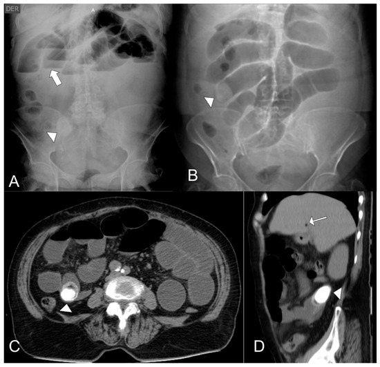 - Lassandro, F.; Romano, S.; Ragozzino, A.; Rossi, G.; Valente, T.; Ferrara, I.; Romano, L.; Grassi, R. Role of helical CT in diagnosis of gallstone ileus and related conditions. Am. J. Roentgenol. 2005, 185, 1159–1165. [Google Scholar] [CrossRef] [PubMed]