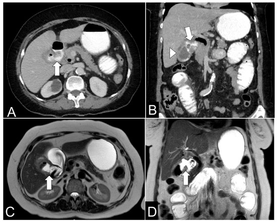 (A) Axial contrast-enhanced abdominal CT scan showing a cholecystoduodenal fistula (arrow) with pneumobilia and passage of oral contrast into the gallbladder. (B) Coronal contrast-enhanced abdominal CT scan demonstrating a cholecystoduodenal fistula (arrow) with oral contrast passage into the gallbladder and cholelithiasis (arrowhead). (C) Axial T2-weighted MR cholangiography showing a cholecystoduodenal fistula (arrow) with pneumobilia. (D) Coronal T2-weighted MR cholangiography depicting a cholecystoduodenal fistula (arrow) with pneumobilia and cholelithiasis.