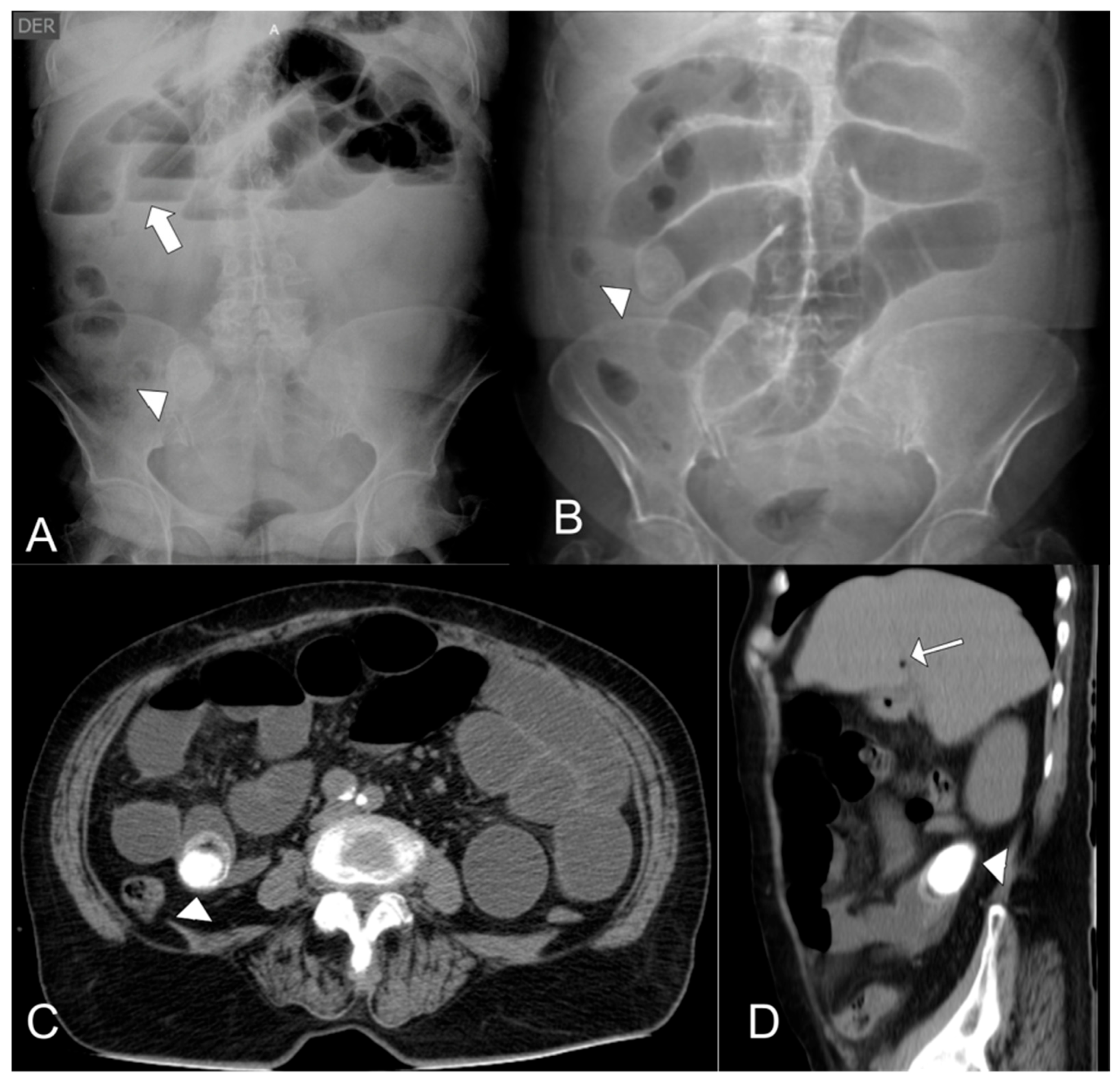 - Nuño-Guzmán, C.M.; Marín-Contreras, M.E.; Figueroa-Sánchez, M.; Corona, J.L. Gallstone ileus, clinical presentation, diagnostic and treatment approach. World J. Gastrointest. Surg. 2016, 8, 65–76. [Google Scholar] [CrossRef] [PubMed]