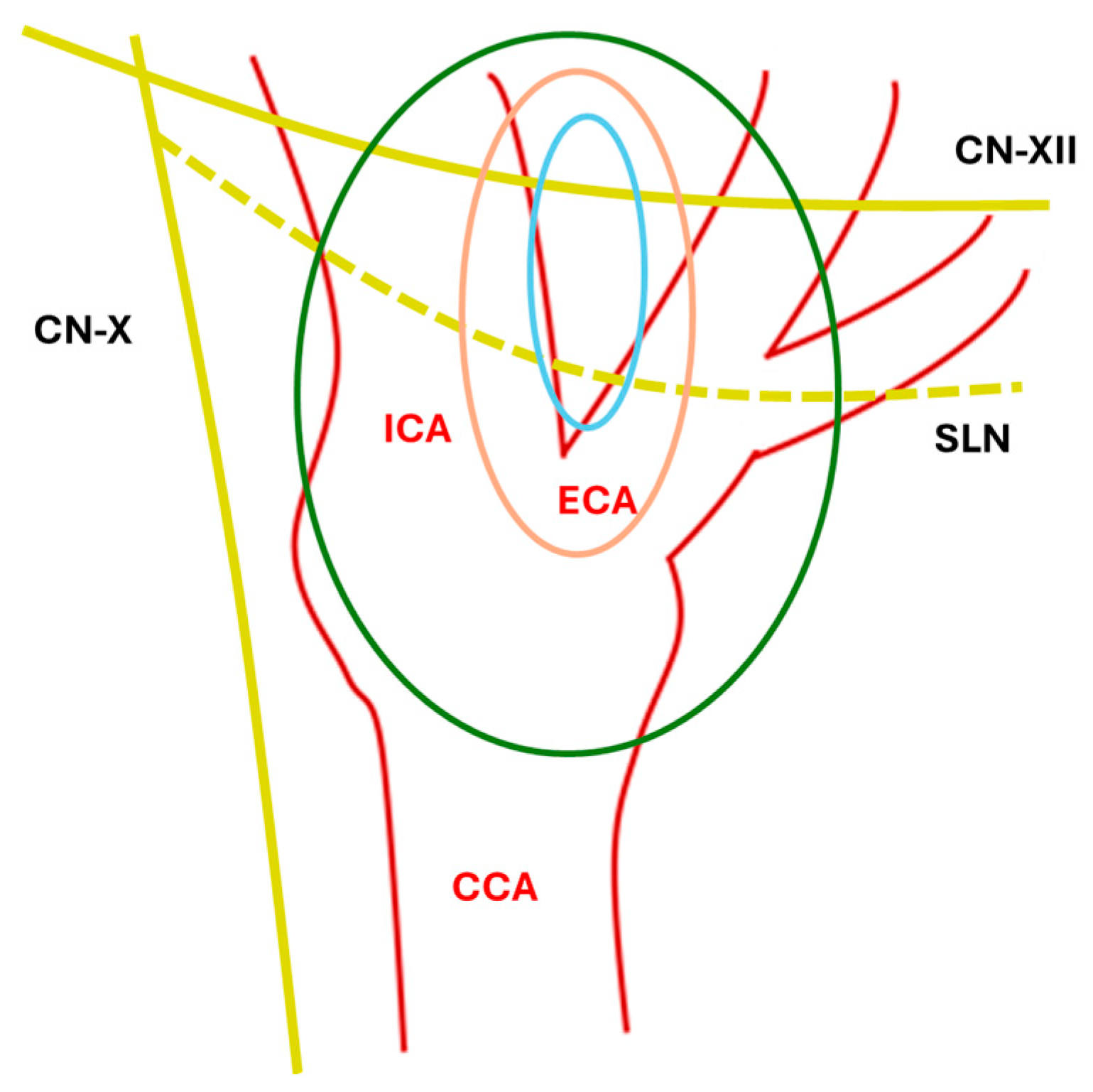 - Lamblin, E.; Atallah, I.; Reyt, E.; Schmerber, S.; Magne, J.-L.; Righini, C.A. Neurovascular complications following carotid body paraganglioma resection. Eur. Ann. Otorhinolaryngol. Head Neck Dis. 2016, 133, 319–324. [Google Scholar] [CrossRef]