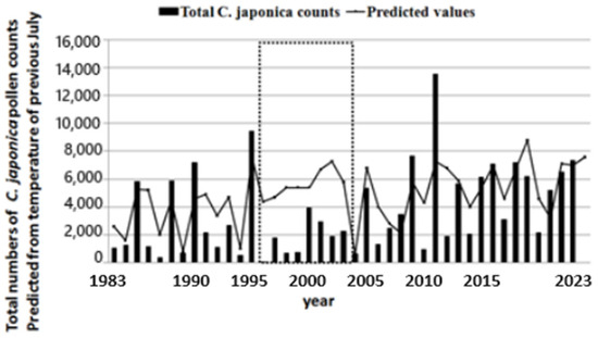 Total numbers of cedar pollen (bar graph) and predicted values (line graph). Period indicated by the dotted line box in the figure (1996 to 2003) did not apply the prediction based on the monthly average of the maximuum daily temperature in July. See Section 6 for details.