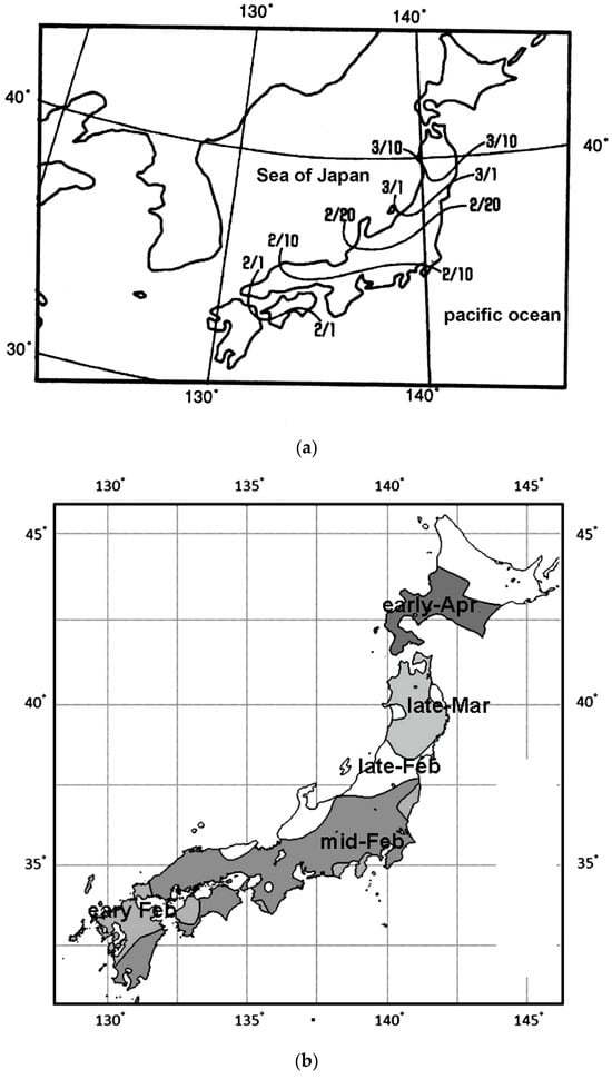 Regarding the first day of cedar pollen season in each year, Sahashi has reported in the Japanese Journal of Palynology every year as “cedar pollen front” namely, the start date of cedar pollen dispersal in each region on a map of Japan (for example, [2,3]). Cedar pollen season starts in the south of the Japanese archipelago and moves north. The information has the advantage that it can be used on the same basis anywhere in the country. Examples of the “cedar pollen front” are shown in Figure 2a,b (a; 6-year mean and b; this year (2023)).