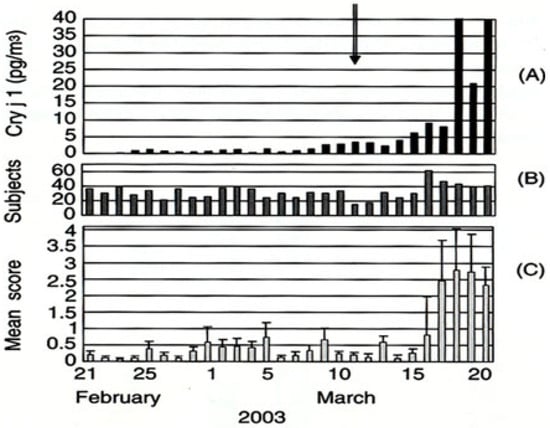 Relationship between airborne Cry j 1 and mean symptom scores of cedar pollinosis patients. The figure shows an example from 2003. The arrow indicates the first day of cedar pollen season [4]. (A) Airborne Cry j 1 concentration, (B) Numbers of subjects each day, (C) Symptom scores.