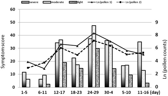Relationship between pollen count and symptom score during 2018. Based on the severity of the symptoms divided into three cases (light, moderate, and severe), the symptom score of each case is presented by the bar graph. The logarithms of the scattered pollen counts are presented in the line graph (solid line: Durham sampler, dashed line: Pollen Robo) [5].
