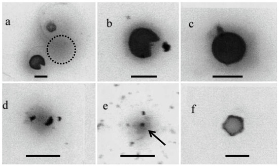 Cry j 1 spots from airborne sample of cedar pollen season treated with anti-Cry j 1 mono- clonal antibody. (a–c): cedar pollen dotted circle in (a): no spot is detected. (d,e): airborne fine particulate. Arrow indicates orbicles confirmed with an electron microscope, (f): Alnus spp. pollen. The unit bar in each figure indicates 30 μm. The magnification is different for each figure.