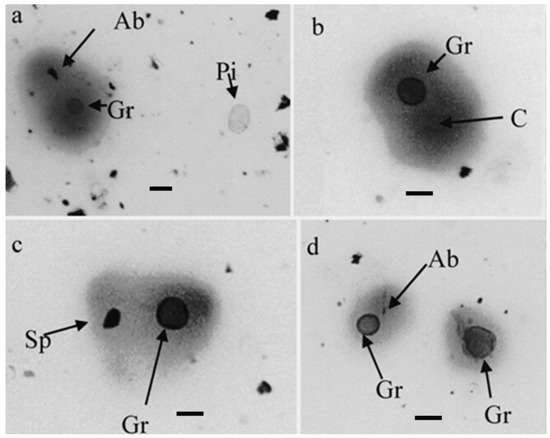 Dac g spots from airborne samples during grass pollen season treated with anti-Dac g rabbit IgG. (a–d) are areas where spots containing grass pollen were observed. The unit bar in each figure indicates 30 μm. The magnification is different for each figure. Abbreviations are as follows: Ab; airborne fine particulate, Gr; grass pollen, Pi; Pinus pollen (no spot is detected), Sp; spore, C; no obvious particle is found.