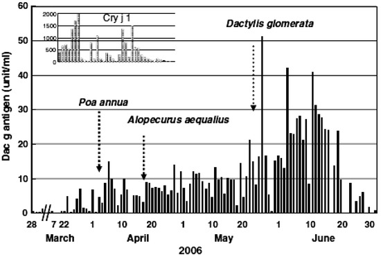 Daily fluctuations of airborne Orchard grass allergen (Dac g allergen) of grass pollen and Cry j 1 allergen measured by immunoblotting in the urban area of Yamagata City where there is no large community [25].