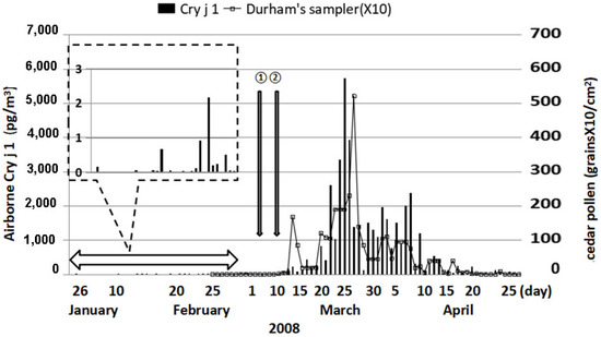 Comparison of daily values of Cry j 1 obtained with ESR radical immunoassay and the cedar pollen with Durham sampler in 2008. The slide glass of the Durham sampler and the sample from cyclone sampler CM90 (Burkard Co., Ltd., Rickmansworth, UK) were exchanged at 7 a.m. every day. The comparison period is cedar pollen season (from the first day of cedar pollen season (11 March) to the end of the pollen season (26 April)). Arrow ①: the first day of cedar pollen observed by microscope, arrow ②: the first day of the cedar pollen season.