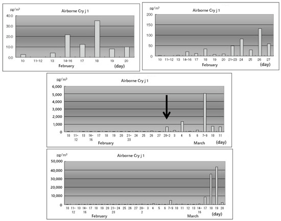 Sensitive patients begin to develop symptoms when airborne Cry j 1 concentration reaches 1 to 20 pg/m3. The time is approximately two to three weeks before the cedar pollen season depending on the year and each patient. This is the time to begin medication for sensitive patients whose symptoms start before the pollen season, and also the time to start the provision of pollen information. Airborne Cry j 1 data was provided by Yamagata Prefecture from 2003 to 2016. These data were provided on the website of the Yamagata Prefectural Institute of Public Health. An example is shown in Figure 11. This data was actually posted on the website in 2015, the first day of the cedar pollen season for that year was March 1st, and the amount of Cry j 1 on that day was 200 pg/m3. A and B in Figure 11 are data before the cedar pollen season. These are useful data for sensitive patients, and we have created this information in the hope that it will serve as a guide to starting treatment or drug therapy. We have discussed the importance of Cry j 1 allergen monitoring as a means of providing for patients with sensitivity to cedar pollen.