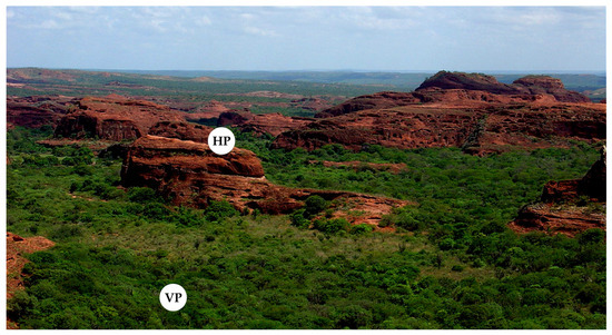 The general aspect of the landscape and vegetation of the CBS, Bahia, semi-arid of Brazil, in the rainy season in February 2005. Valley point (VP) and hill point (HP) show where pollen Tauber collectors were placed.