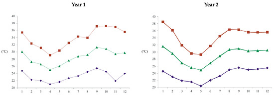 Monthly averages of maximum temperatures (°C) recorded for the CBS (Canudos, Bahia, Brazil) during the study period (March 2003 to February 2005). Top line: averages of the maximum temperatures; middle line: average of the mean temperatures; and bottom line: average of the minimum temperatures.