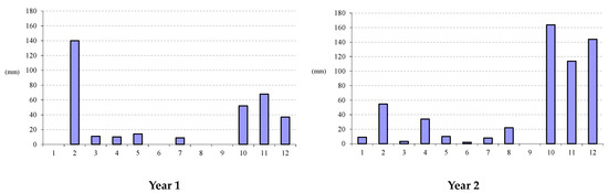 Correlation analyses for the pollen spectra from years 1 and 2, based on data from the valley and hill collectors and the average maximum temperature values (Figure 3) and rainfall (Figure 4) for the respective years, revealed positive correlations between the increase in temperature in year 1 and the increase in pollen deposition in the valley collectors (R = 0.5804). However, these results appeared inconsistent within the broader context of local pollen rain, as it would be expected that the gradual increase in temperature during year 1 would also reflect an increase in pollen deposition in the hill collectors, not just in the valley collectors. Conversely, one would anticipate that the increased pollen deposition in the valley collectors during year 1 would similarly affect pollen deposition in the hill collectors in the same year, which was not observed.