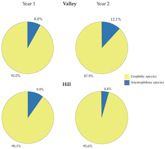 Analysis of the percentages of pollen types associated with anemophilous and zoophilous species in the valley and hill collectors (Figure 5) indicated that the atmospheric pollen spectrum in the studied area is predominantly composed of pollen grains from zoophilous species, with a smaller proportion originating from anemophilous species.