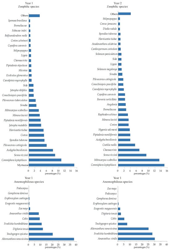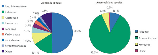 The insect pollination system has been the most prominent in records for many studied areas, regardless of the plant community [60]. However, the fact that most species in an area exhibit zoophilous pollination—whether by insects or other animals—does not necessarily mean that these will be the most represented in pollen rain spectra. Generally, the number of pollen grains produced by individuals of anemophilous species (e.g., grasses and amaranths) can be hundreds of times greater than that produced by herbaceous or shrubby zoophilous species.