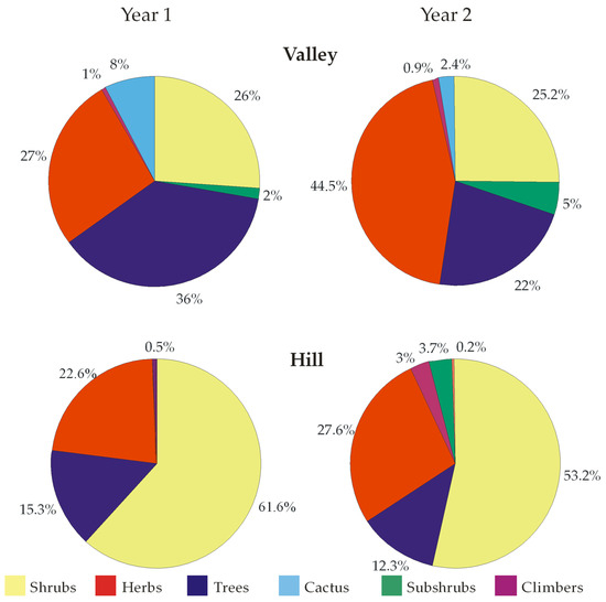 Thus, it became clear from the presented percentages, regardless of the analyzed year, that trees, subshrubs, herbs, and cacti were the most represented elements in the valley area, while shrubs dominated the hill area. Based on the vegetation structure, such representatives were expected for the valley area. For the hill area, however, one would anticipate a greater representation of herbaceous elements (many grasses) rather than shrubs, as observed in the vegetation.