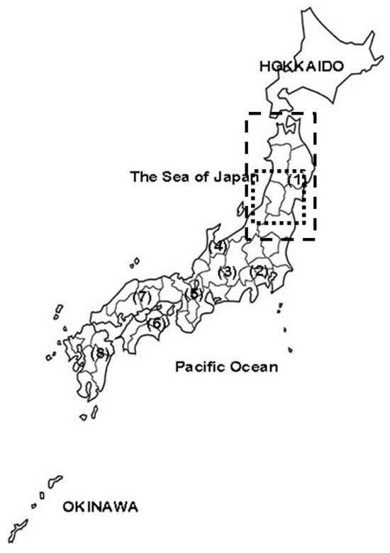 The location on the map of Japan of the Tohoku region. The area surrounded by a dashed square was the subject of the survey. The locations of each region listed in the results are as follows: (1): Tohoku region; (2): Kanto region; (3): Chubu region; (4): Hokuriku region; (5): Kansai region; (6): Shikoku region; (7): Chugoku region; (8): Kyushu region.